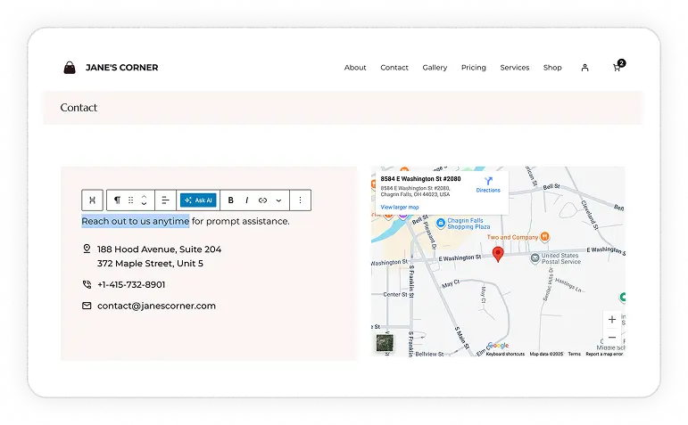 Add ready-made pages like pricing and contact forms in just one click – no technical skills required.
